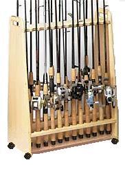 ![]() 24 Rod Rack on wheels Freshwater Holds 24 freshwater rod and reel combos. Each rack gets a protective lacquer finish. 32 L x 11 D x 33 H. Need a custom rack? No problem just fill out a custom order form. |
